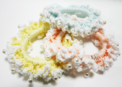 黄色、水色、ピンクの三色がベースで、白のレース部分にパールビーズが編み込んであります。